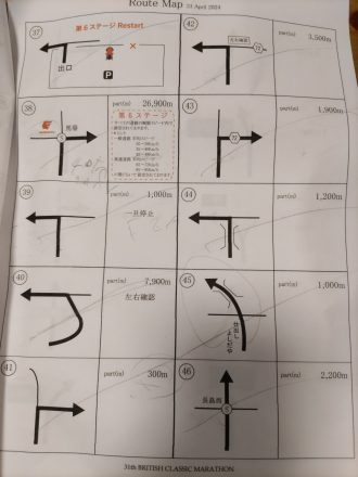 このようなコマ図と言われる地図を見ながら、ドライバーとコ・ドライバーの2名でのドライビングです。